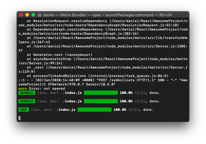 *설치 후 아래와 같은 메세지와 함께 run-ios가 되지 않으면 프로젝트 내 ios폴더에서 pod install로 에뮬레이터에 모듈을 올려준다.